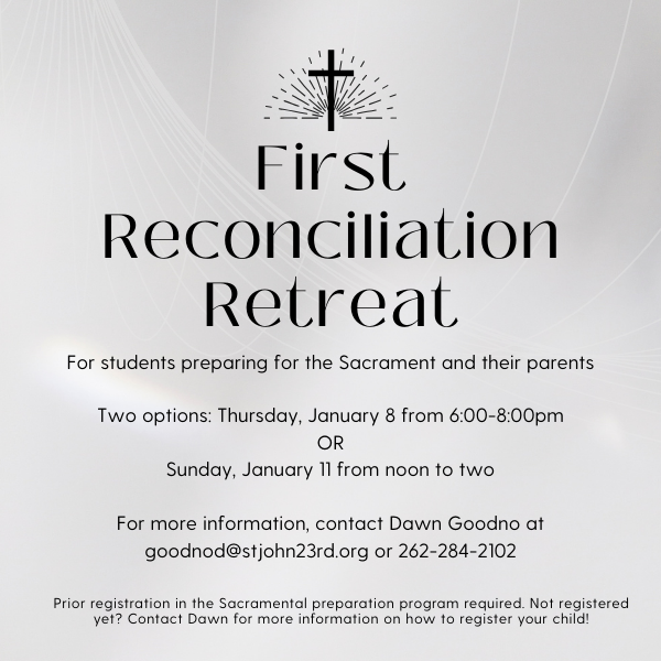 January 8 at 6:30pm in Room 141/142 First Reconciliation Retreat