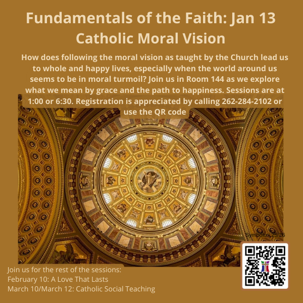 How does following the moral vision as taught by the Church lead us to whole and happy lives, especially when the world around us seems to be in moral turmoil? Join us in Room 144 as we explore what we mean by grace and the path to happiness. Sessions are at 1:00 or 6:30. Registration is appreciated here or by calling 262-284-2102
