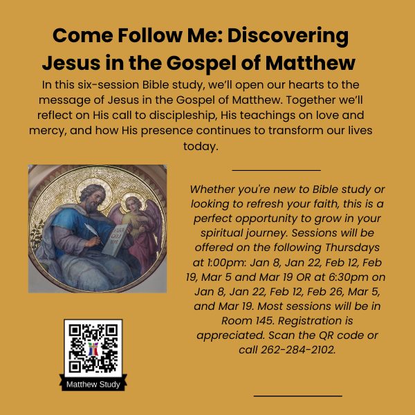 January 8 at 1:00pm in Room 145 or 6:30pm in Room 143 (Formation Office) The Gospel of Matthew Bible Study In this six-session Bible study, we’ll open our hearts to the message of Jesus in the Gospel of Matthew. Together we’ll reflect on His call to discipleship, His teachings on love and mercy, and how His presence continues to transform our lives today.