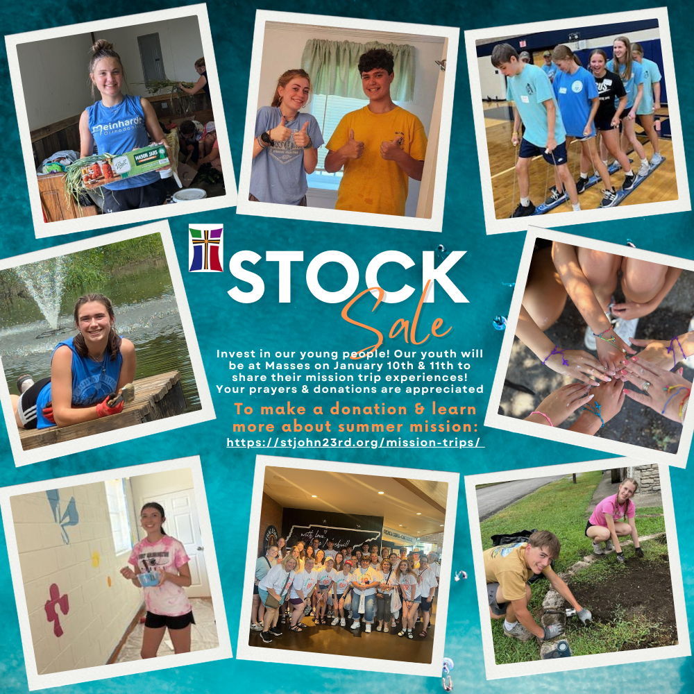 Invest in our young people! Looking for a solid investment for the future? Then consider buying “stock” in the young people of the Parish. Some young people from our parish will be conducting a stock sale after all of the Masses the weekend of January 10-11 in support of the Mission Trip they will be participating in to Knoxville, locally in southeast Wisconsin and other Youth Ministry activities. Your investment in our young people ensures that anyone who feels called to this ministry is able to participate. Contributions of any size are welcome, especially your prayers! For more information and a video of our trip last summer, go to https://stjohn23rd.org/mission-trips/ . You may also donate here.