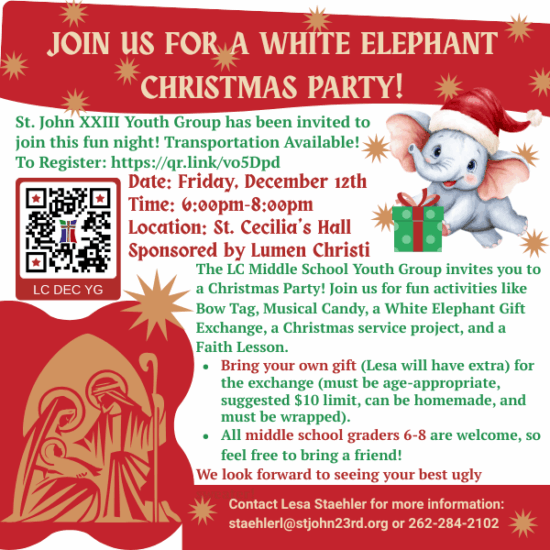 December 12 at 6:00 at Lumen Christi in Mequon White Elephant Christmas Party Youth Group Gr 6-8