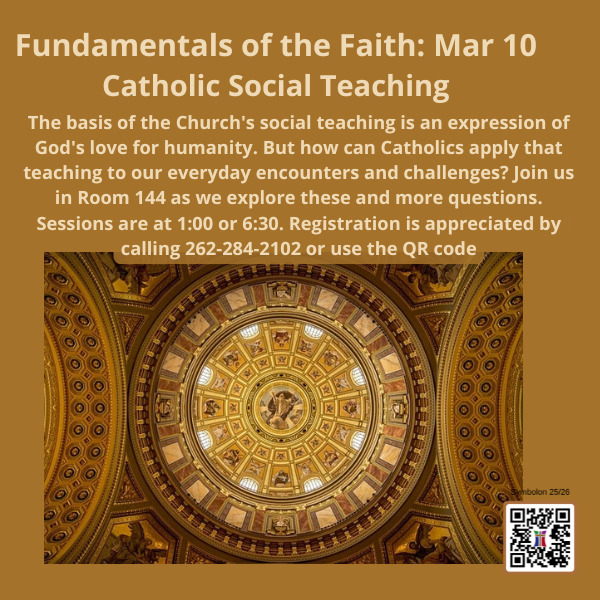 March 12 at 6:30pm in Room 144 Fundamentals of the Faith: Catholic Social Teaching