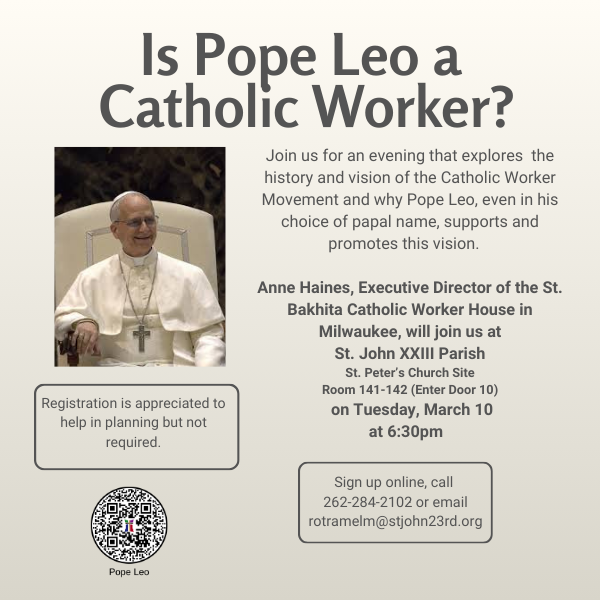 Join us for an evening that explores the history and vision of the Catholic Worker Movement and why Pope Leo, even in his choice of papal name, supports and promotes this vision.