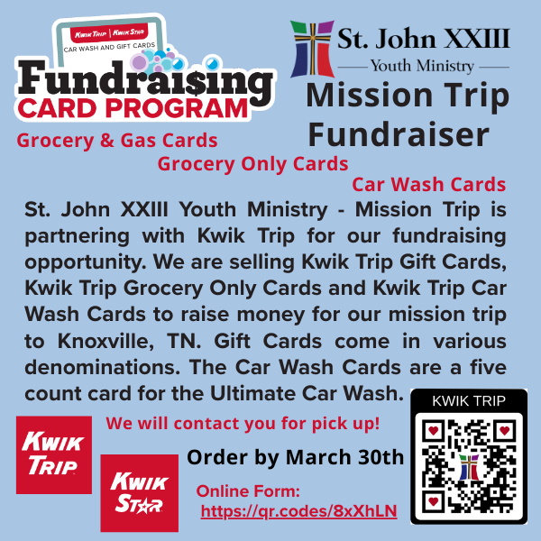 Kwik Trip Cards for Sale to support our Youth Mission Trips. Order by March 30th!