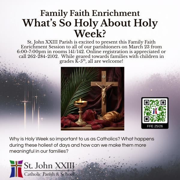 March 23 at 6:00pm “What’s So Holy About Holy Week” Family Faith Enrichment in Rooms 141/142 Why is Holy Week so important to us as Catholics? What happens during these holiest of days and how can we make them more meaningful in our families?