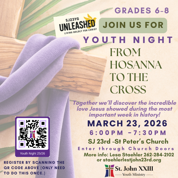 March 23 at 6:00pm “From Hosanna to the Cross” Youth Night Together we’ll discover the incredible love Jesus showed during the most important week in history! Open to 6th-8th graders; high school helpers are also welcome. Enter through the main church doors.