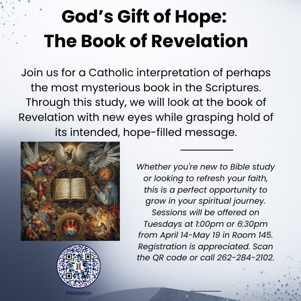 Join us for a Catholic interpretation of perhaps the most mysterious book in the Scriptures. Through this study, we will look at the book of Revelation with new eyes while grasping hold of its intended, hope-filled message.