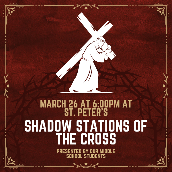 March 26 at 6:00pm Shadow Stations of the Cross at St. Peter’s Church All are invited to join our middle school students as they lead us in a powerful prayer experience walking with Christ on His journey to the Cross.