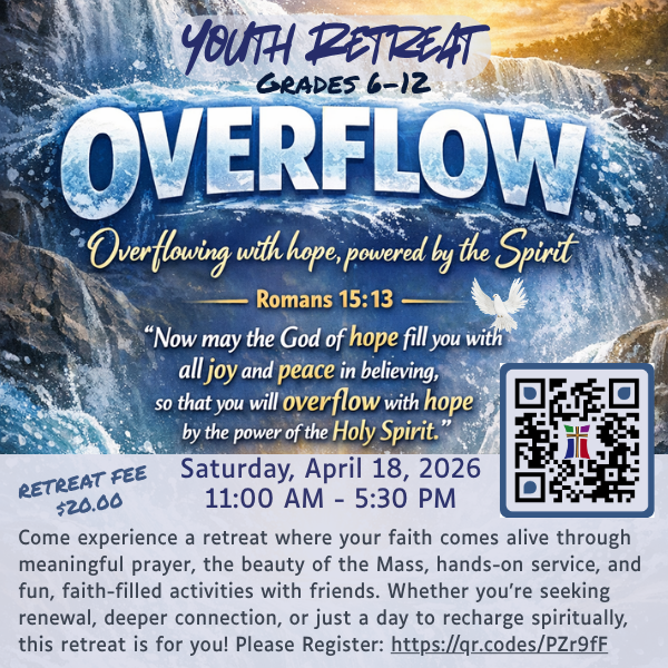 April 18 from 11:00am-5:30pm “Overflow Youth Retreat” for Grades 6-12